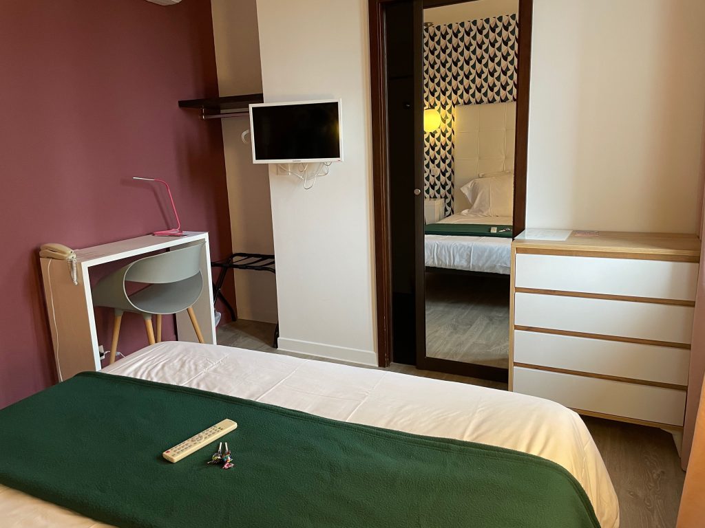 Les chambres climatisées de l’Hôtel Mirano affichent une décoration inspirée des années 1970. Elles disposent d’une télévision et de rangements.